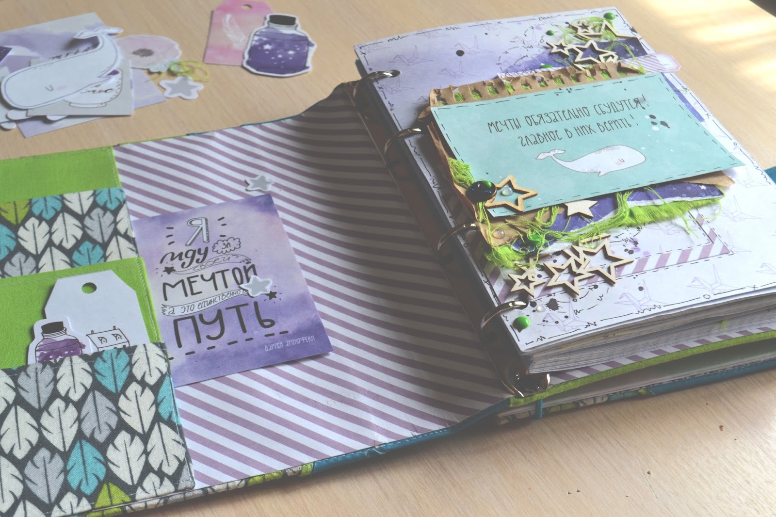 Кроме того, есть простые разделители разделов из скрапбумаги (Доходы\расходы; Идеи; Проекты; МКи Вебинары ,а так же Wishlist) и конверт, где теперь хранятся листочки, на которых я пробовала трафареты и спреи.